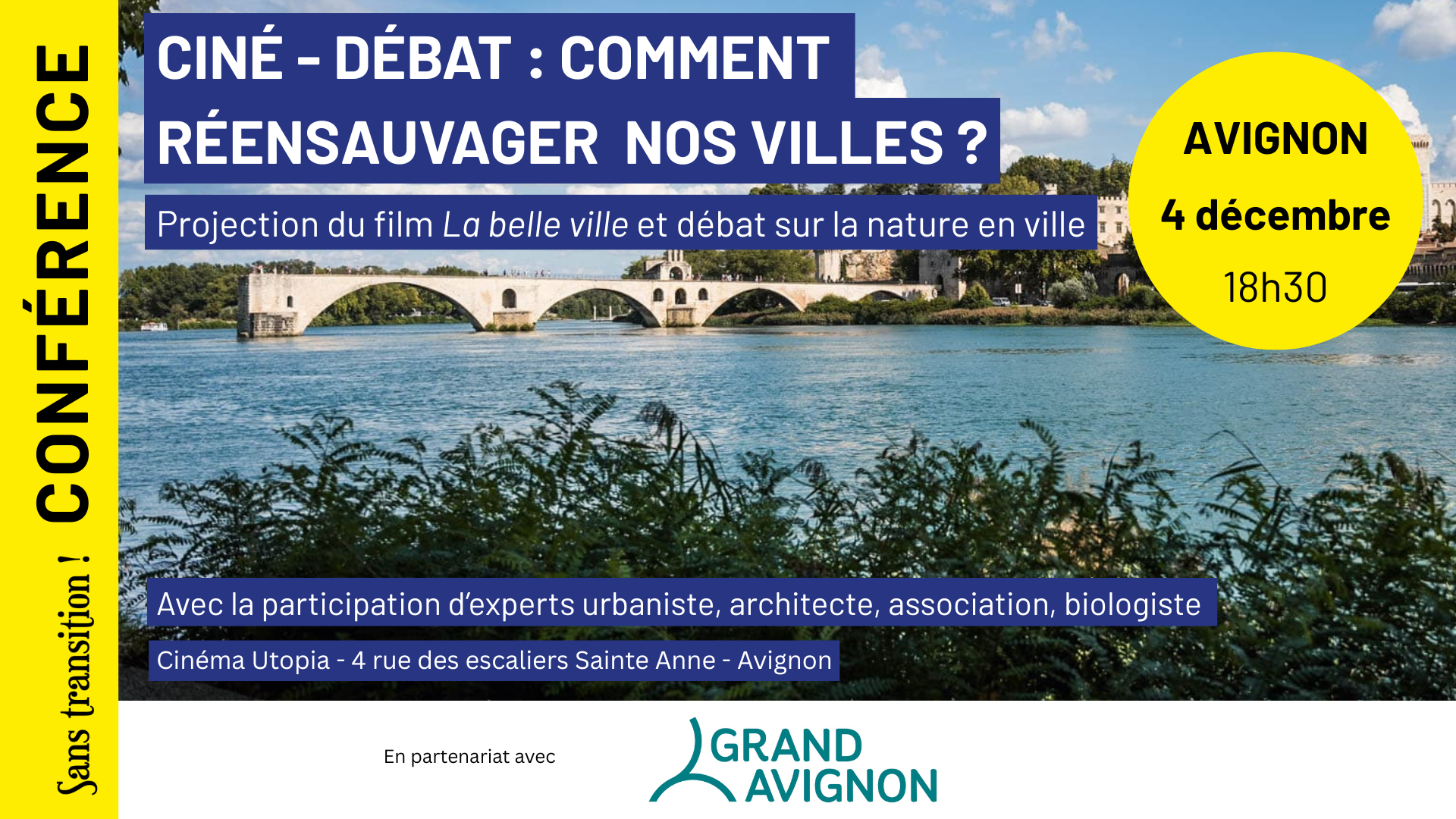 A l'occasion de la projection du film "La belle ville" le 4 décembre au Cinéma Utopia d'Avignon, offerte par le Grand Avignon, Sans transition! anime un débat dédié à la nature en ville, à l'issue de la projection.