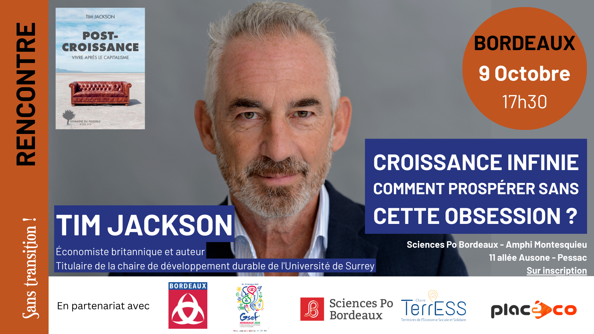 Le 9 octobre, Sans transition! a réuni à Sciences-Po Bordeaux l’économiste britannique Tim Jackson pour une rencontre consacrée à la question : « Croissance infinie, comment prospérer sans cette obsession ? ». Auteur de Prospérité sans croissance et plus récemment de Post-croissance, Jackson a invité le public à explorer de nouveaux horizons économiques au-delà de l’accumulation matérielle.