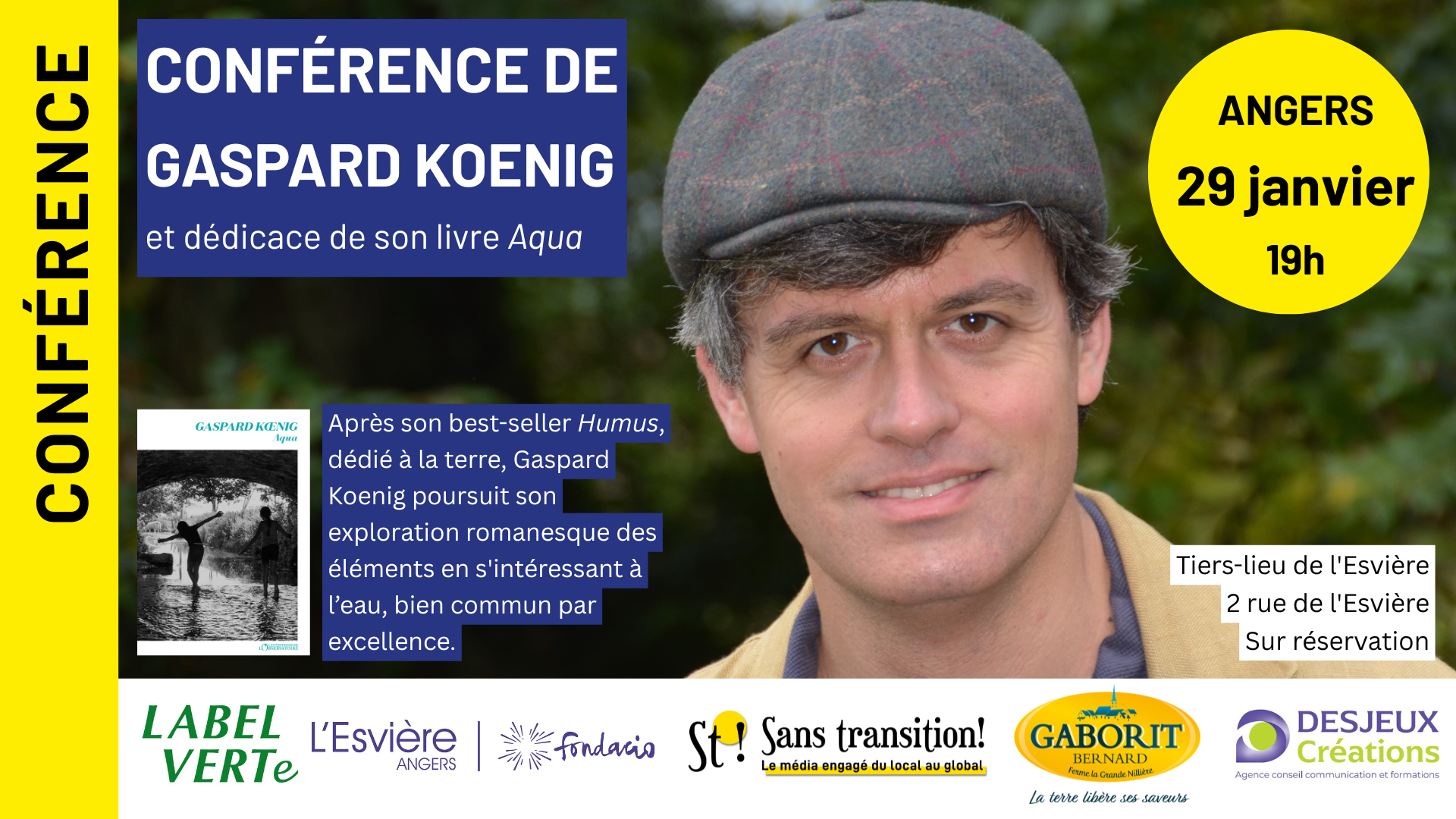 A Angers, le Tiers-lieu de l’Esvière, LABEL VERTe et Sans transition!, avec le soutien de la Maison Gaborit et de Desjeux Créations, vous proposent la conférence-dédicace de Gaspard KOENIG, le jeudi 29 janvier 2026 dans les locaux du Tiers-lieu dès 19 heures.