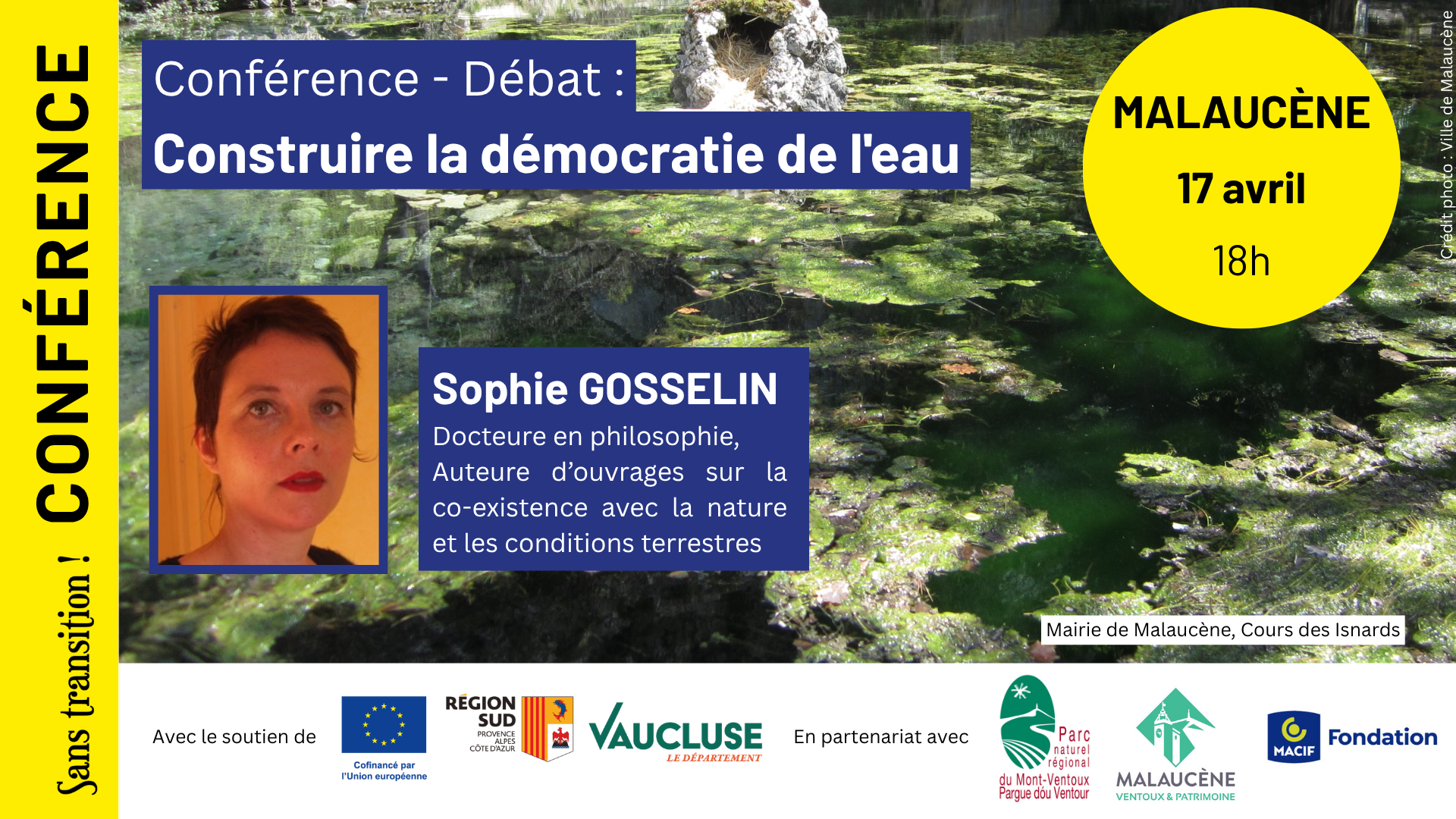 Troisième opus du projet "Les pieds dans l'eau", après les rencontres avec Charlène Descollonges puis Freddy Rey, cette nouvelle conférence-débat avec Sophie Gosselin, Docteure en philosophie et autrice, vous est proposée le vendredi 17 avril à 18h à Malaucène (84), et intitulée :