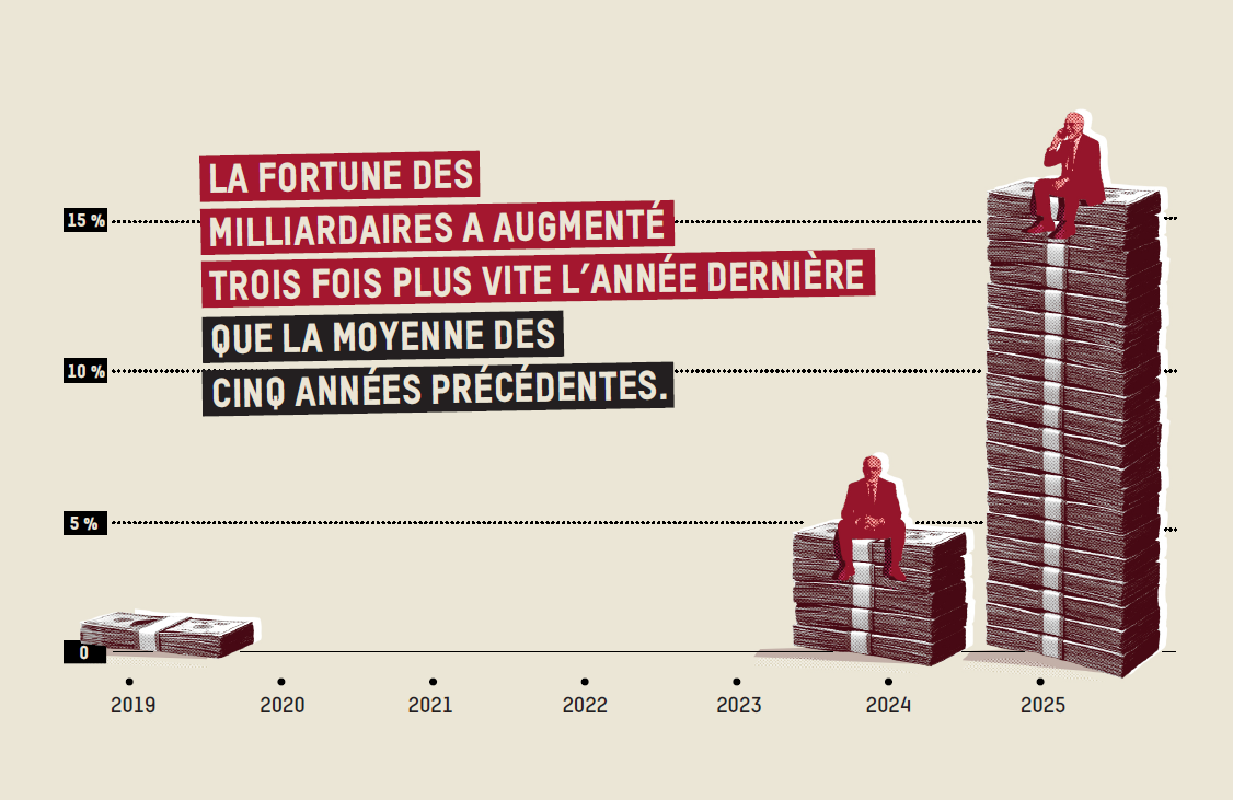 Dans un nouveau rapport publié le 19 janvier par Oxfam à l’occasion de l’ouverture du Forum économique mondial à Davos, on apprend que la fortune des milliardaires a bondi de plus de 16 % en 2025, soit trois fois plus vite que la moyenne des cinq années précédentes, pour atteindre 18 300 milliards de dollars, son plus haut niveau historique. La barre des 3 000 milliardaires a aussi été franchie pour la première fois l’année dernière. La fortune des milliardaires a augmenté de 81 % depuis 2020. Et ce, alors même qu’une personne sur quatre n’a souvent pas de quoi manger à sa faim et que près de la moitié de la population mondiale vit dans la pauvreté.