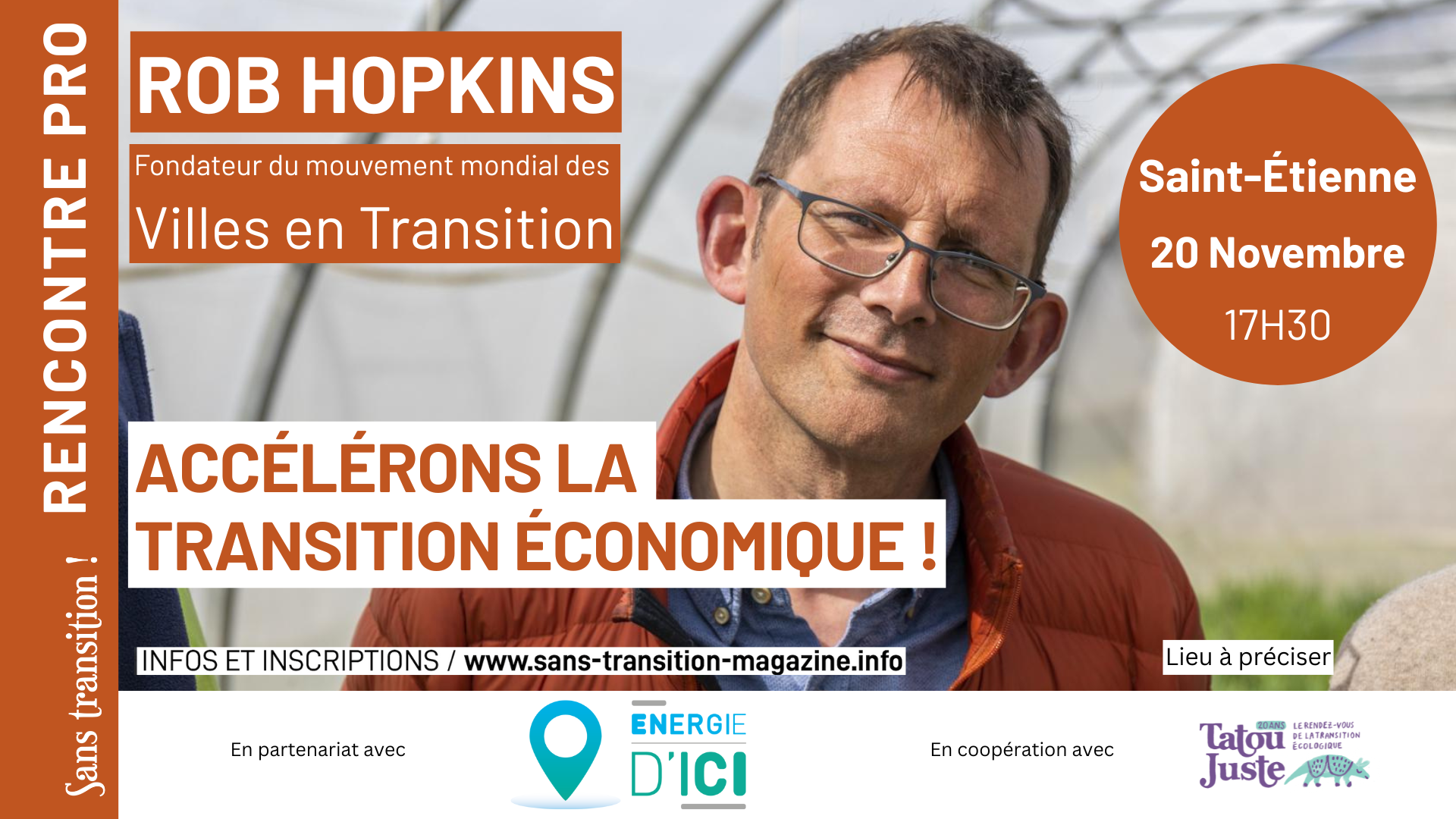 Sans transition! et Energie d'Ici sont heureux de proposer aux acteurs économiques de la Métropole de Saint-Étienne une rencontre participative avec Rob Hopkins, le jeudi 20 novembre, de 17h30 à 19h à Saint-Étienne (lieu à confirmer).
